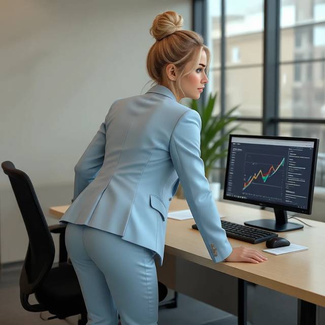 Не дожидаясь ответа, она сразу направилась к своему столу, наклонилась и заглянула в монитор на графики, а затем, сделав небольшой глоток бодрящего напитка, опустилась свою юзаную попку на стул.