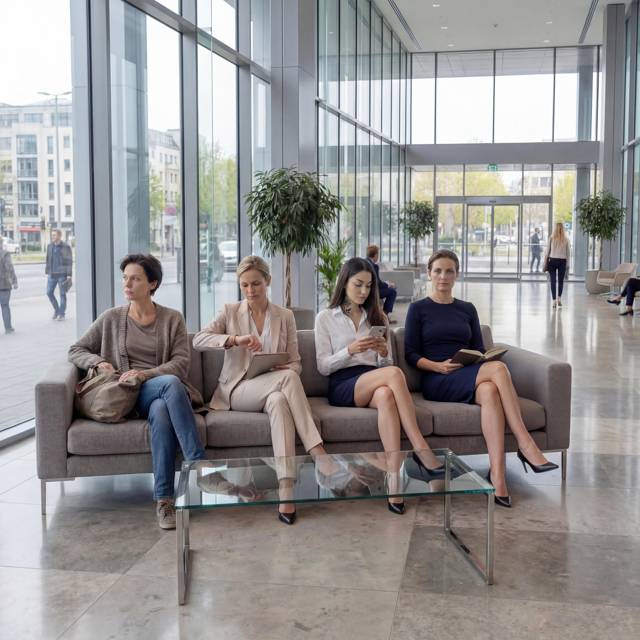 Первая, чуть поодаль, была женщиной лет сорока с коротко подстриженными темными волосами, в уютном, немного помятом кардигане и джинсах. Она смотрела в окно с задумчивым, даже немного грустным видом, держа на коленях объёмную сумку-шопер. Она выглядела как кто-то, кто пришёл по личным, а не по деловым делам.