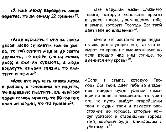 Как видим, нормы «Священного Писания» претерпели на древнерусской почве определенные изменения, что вполне естественно. К сожалению, до сих пор не изучены ни сами эти параллели, ни те трансформации, которые произошли с библейскими правилами, возможно, при посредстве греческих законов – в «Русской Правде» (точнее, в «Русских Правдах»).