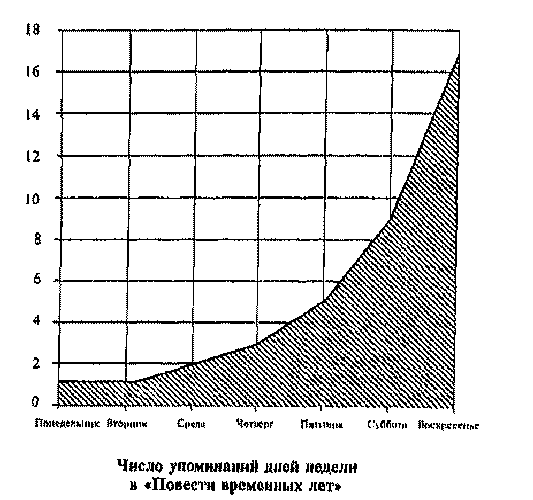 Время, подобно пространству, в сознании древнерусского человека было наделено нравственно-этической ценностью. Практически любая календарная дата рассматривалась им в контексте ее реального или символического наполнения. Об этом можно судить даже по частоте тех или иных календарных упоминаний. Так, в «Повести временных лет» понедельник и вторник упоминаются всего по одному разу, среда – дважды, четверг – трижды, пятница – пять раз, суббота – 9, а воскресенье («неделя») – целых 17! Естественно, это говорит не столько о «любви» или, напротив, нелюбви к определенным дням, сколько о «наполненности» их событиями, которые интересовали летописца и его читателей. Так, например, закладка и освящение храмов, перенесение мощей обычно совершались по субботам и воскресеньям.