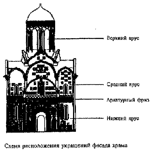 Следующим важным элементом внешнего облика храма являются украшения фасада. Судя по всему, внешние изображения делили поверхность храма на три яруса, или регистра. Каждый из них нес свою содержательную нагрузку. Они символизировали уровни восхождения от грешной земли к небу.