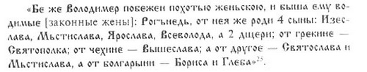Перечень этот уже давно вызывал недоумение ученых. Не удавалось установить, в частности, почему здесь говорится о 10 сыновьях Владимира, тогда как в другом перечне – под 6496 (988) г. – названо 12 имен. Непонятно, для чего летописцу понадобилось упоминать двух дочерей киевского князя. Совершенно неясны основания, на которых автор «Повести» «распределил» Владимировичей по женам отца.