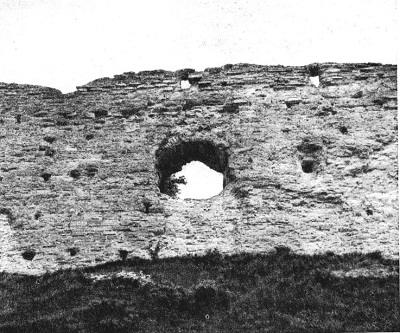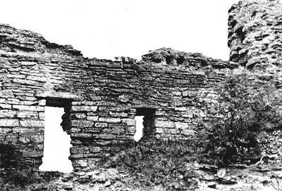 [Закрыть]. Их кладка идентична кладке башен. Она состоит из местного известняка, серого (изредка – красноватого или лиловатого) по цвету, и скреплена известковым раствором. Размеры камней везде разные; в одних случаях они широкие, толщиной более 30 см, а в других – тонкие, 2–3 см. Это обусловлено, вероятно, мощностью слоев разработанного карьера. Тонкие плиты употреблены в основном для выравнивания кладки. Последняя преимущественно горизонтальная, с выдержанной перевязкой швов, однако в некоторых местах небольшие камни положены и на ребро. Какого-либо существенного отличия, как это указывал П. П. Покрышкин, кладка юго-западной стены не имеет. Эта стена сложена также тщательно, как и противоположная – северо-восточная. Разница состоит только в том, что наружные поверхности стен осыпались в одних местах почти полностью, а в других – еще сохраняются их лицевые камни. Как и в башнях, эти камни уложены весьма аккуратно и имеют хорошо отесанные поверхности.