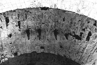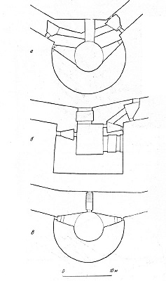 Верхние ярусы башен отделялись друг от друга «мостами» – плоскими деревянными перекрытиями (рис. 11). О их существовании говорят теперь небольшие поярусные уступы в кладке башенных стен, гнезда от балок, сохранившиеся в их толще, и отпечатки торцов бревен, оставшиеся в некоторых местах на обнажившихся массах связующего раствора. Расположение гнезд и отпечатков бревен показывает, что конструктивное устройство междуэтажных перекрытий башен было разным. В одних случаях это был сплошной бревенчатый накат, а в других – дощатые полы, уложенные на редко поставленные балки, ниже которых, примерно на расстоянии 1–1,5 м, находились вторые ряды балок, лежавших перпендикулярно верхним.