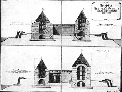 ЦГВИА, ф. 3, оп. 44, № 120 и 121. В связи с тем, что на этих чертежах некоторые башни именуются по-разному, мы называем их в основном по чертежу 1740 г. и по разрезам башен, публикуемым ниже. В скобках указываем названия этих башен соответственно чертежу 1741 г.