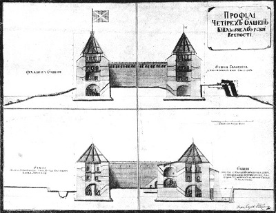 Рис. 26. Разрезы Головиной, Воротной, Меньшиковой и Королевской башен крепости Орехов. Чертеж 1739 г.