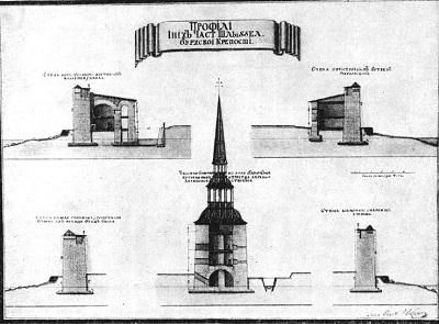 Рис. 28. Разрезы стен и внутренней Часовой башни крепости Орехов. Чертеж 1739 г.