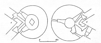 Рис. 30. Планы сохранившихся башен крепости Орехов по подошвенным боям. (По материалам Ленинградского областного отдела по делам строительства и архитектуры). а – Королевская; б – Головина