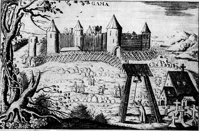 Рис. 33. Общий вид крепости Ям. Гравюра из книги А. Олеария. XVII в.