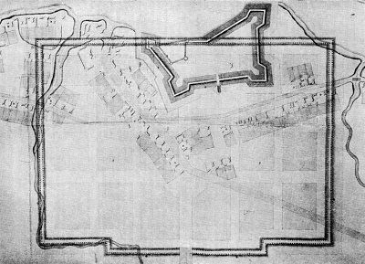 Рис. 36. «План города Ямбурга с положением крепости и прежних обывательских дворов». Чертеж второй половины XVIII в.