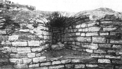 [Закрыть] (рис. 38), показывает, что изнутри башня была сложена из весьма правильных и довольно крупных блоков слоистого известняка, что в плане она имела круглую форму и что открытая амбразура была сводчатой бойницей подошвенного боя; узкое прямоугольное отверстие бойницы выходило наружу, а расширяющаяся раструбом печура – в пространство нижнего этажа.
