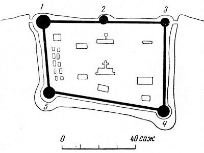 Рис. 6. План крепости (по чертежу, приведенному на рис. 5). Башни: 1 – Георгиевская; 2 – Водяная; 3 – Никольская; 4 – Чепучинная; 5 – Ерзовская