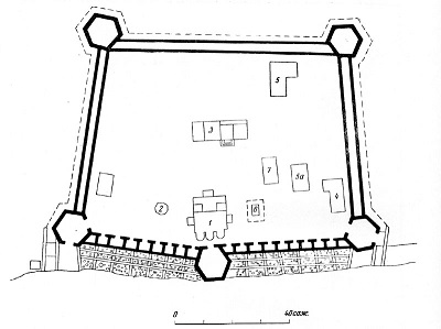 Рис. 9. План крепости (по чертежу, приведенному на рис. 7). 1 – церковь; 2 – колокольня; 3 – канцелярия; 4 – гауптвахта; 5, 5а – магазины; 6 – пороховой погреб; 7 – винный подвал