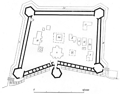 Рис. 10. План крепости (по чертежу, приведенному на рис. 8.) 1 – Водяные ворота; 2 – потайной выход; 3, 3а, 3б – ров; 4 – церковь; 5 – колокольня; 6, 6а – пороховые погреба; 7 – артиллерийский цейхгауз; 8 – канцелярия; 9 – гауптвахта; 10 – старый воеводский дом; 11 – винный погреб; 12, 12а – магазины; 13 – гостиный двор