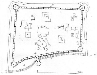 Рис. 12. План крепости (по чертежу, приведенному на рис. 11). 1, 1а, 1б, 1в – башни, на которых стоят пушки; 2 – Воскресенская церковь; 3 – Никольский придел; 4 – Георгиевский придел; 5 – Спасская теплая церковь; 6 – Благовещенский храм; 7 – гауптвахта; 8, 8а – пороховые погреба; 9 – артиллерийский цейхгауз; 10, 10а – магазины; 11 – винный погреб; 12 – воеводский двор; 13 – воеводские амбары; 14 – колокольня; 15, 15а, 15б, 15в – ход подле стены; 16, 16а, 16б – сухой ров; 17 – отруб; 18 – Водяные ворота; 19 – воеводская канцелярия