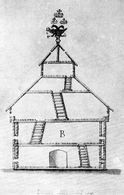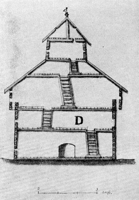Боевые отверстия третьего яруса башни были прорезаны непосредственно в обламах. Сквозные окна имелись даже в наклонных плоскостях шатра дозорной вышки, но здесь они служили, несомненно, для выхода дыма и пороховых газов. Четвертый же ярус не был боевым; он имел меньшую высоту и был темным, без боевых окон. Возможно, что здесь сосредоточивалось подсобное хозяйство башни.
