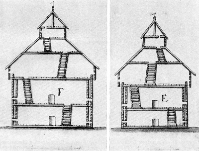 Рис. 20. Разрезы Пытальной (F) и Чепучинной (Е) башен (по чертежу, приведенному на рис. 15)