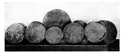 Надо больше обратить внимания на поиски и систематизацию древних каменных ядер. При исследовании Новгородского кремля в слое строительного мусора были обнаружены «каменные шары», видимо, ранее использовавшиеся в кладке стен конца XV в. При этом авторы сообщают только, что эти шары употреблялись в древности для «оборонных целей» (А. А. Строков и В. А. Богусевич. Предварительный отчет о раскопках в Новгороде в 1939 г. Новгородский исторический сборник, вып. 7, Новгород, 1940, стр. 3).