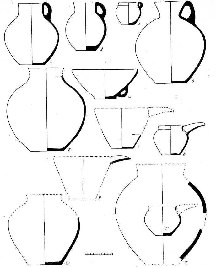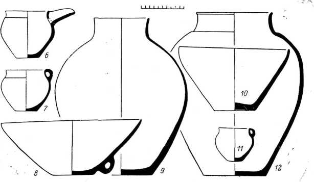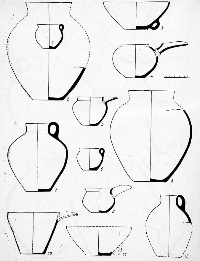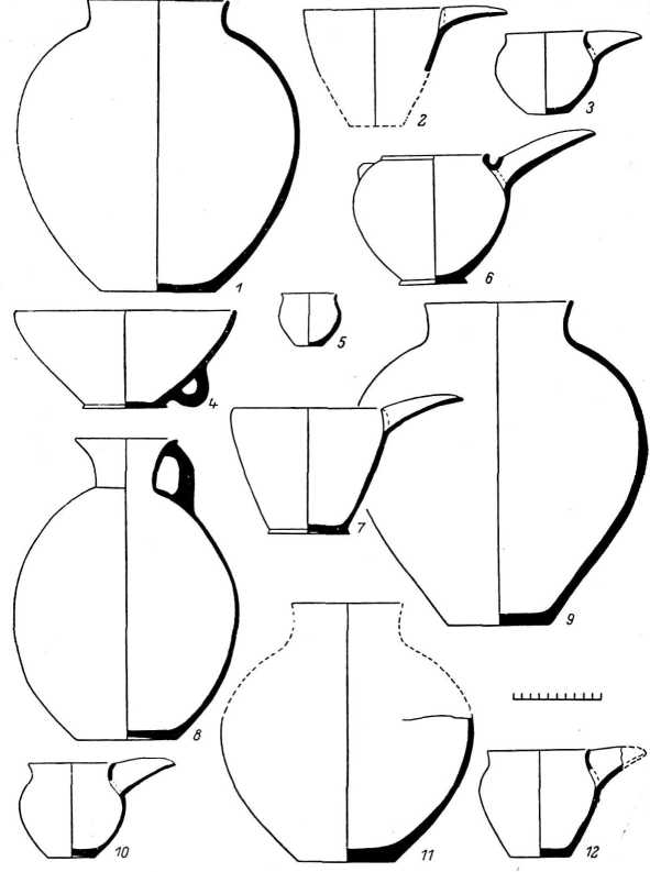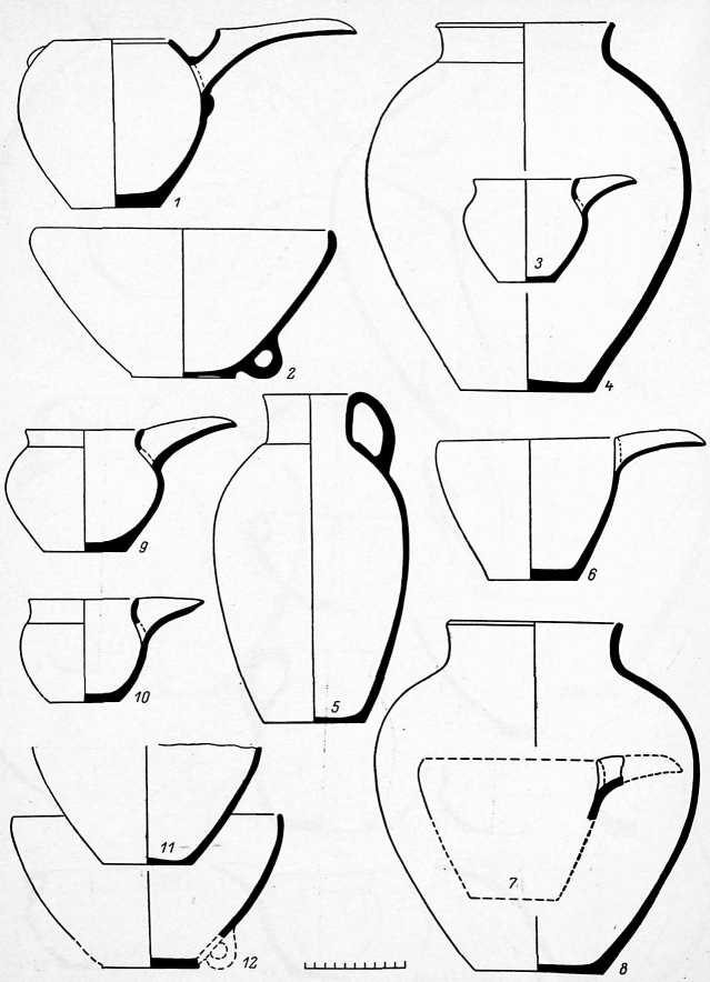 Табл. XXXIX. Могильник Сумбар I. Керамика. 1—6 — мог. 68; 7, 3 — мог. 73; 9, 10 — мог. 77; 11, 12 — мог. 80