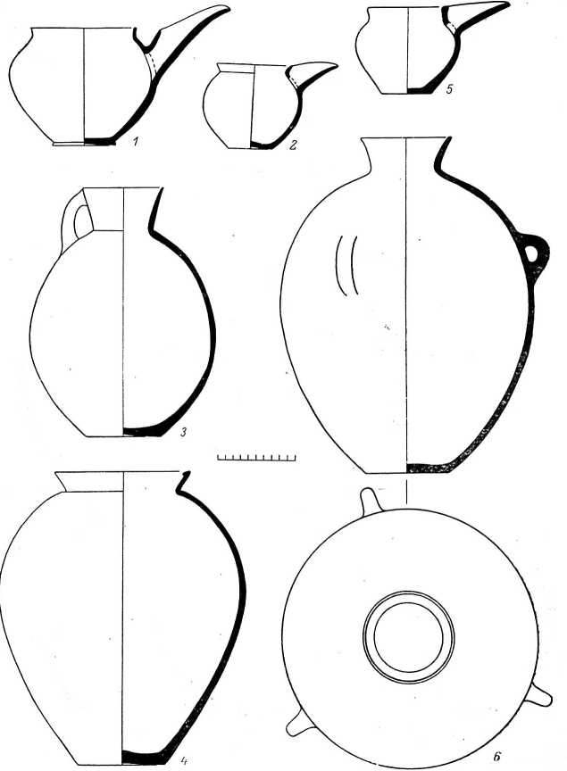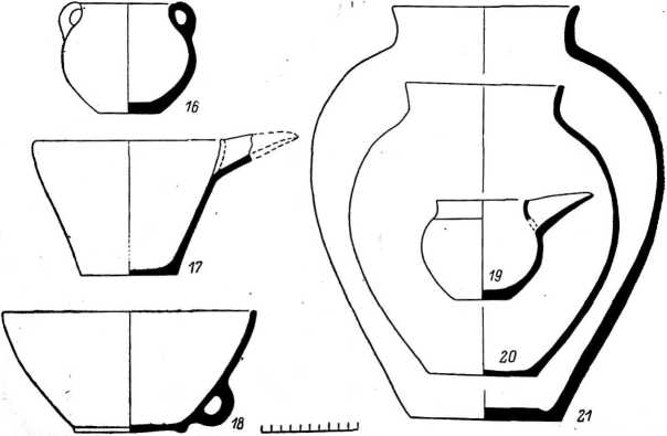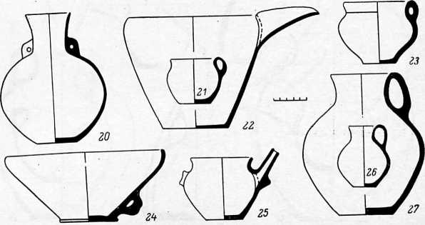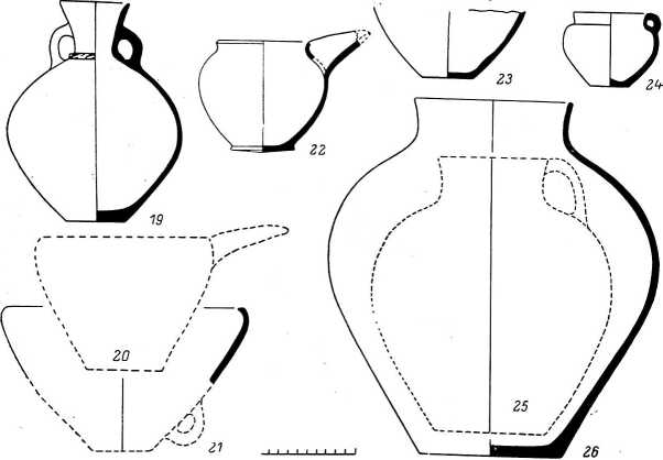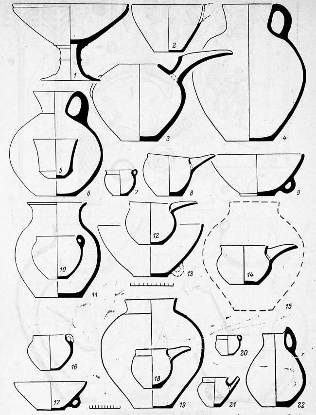 19. Овальная камера, 2X1.5 м. Колодец (?) заложен кирпичами. Погребение (кенотаф) нарушено. Комплекс погребального инвентаря нарушен; он расположен так, как будто погребенный (мужчина) лежал на левом боку, лицом ко входу, головой вправо от него; сосуды для воды в ногах. Находки: хумча (1а.Лк.5/5), горшочек с открытым носиком (П.Кс.2/2), чаша (Шб.Кс.2/2), два конических сосуда со сливом (ГУа.Лк.5/5 и IVa.Kc.4x/4), кувшин (УПб.Кс.2/2) (табл. LX, 4—9), бронзовые черешковый наконечник стрелы (табл. LXI, 3), наконечник дротика (табл. LXI, 5) и колечко, две каменные бусины, три альчика.