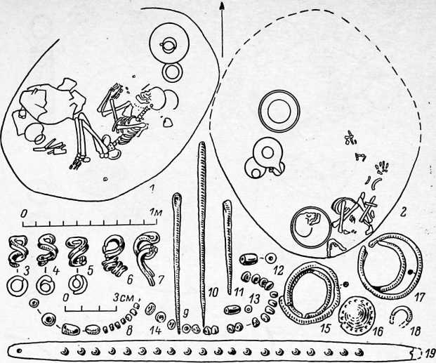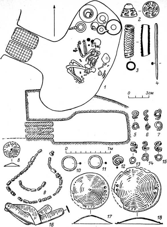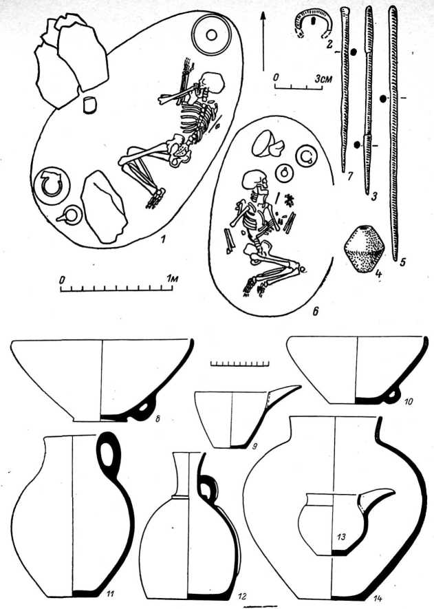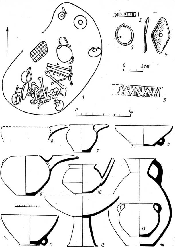 14. Овальная камера, 2.05X1.25 м. Колодец (?) заложен кирпичами. Погребение сохранилось, но средняя часть скелета потревожена норой: женщина 40 лет на правом боку, головой на С, лицом ко входу, на 3; сосуды для воды в ногах. Перед грудью и животом лежит скелет семимесячного младенца на спине. Комплекс погребального инвентаря сохранился. Находки: хумча (1а.Лк.5/5), горшочек с открытым носиком (П.Лк.5/5), чаша (Шб.Лк.5/5), конический сосуд со сливом (IVa.Kc.3 + x/3), чайник (Уа.Лк.5/5), кувшин (УПа.Лк.5/5), бронзовые два ножа, три спиральных кольца для волос, две булавки с павер-шиями, браслет, 40 бусин, две бляхи, костяная поделка с насечками (табл. ЫП, 1-11-, LIV, 8—13).