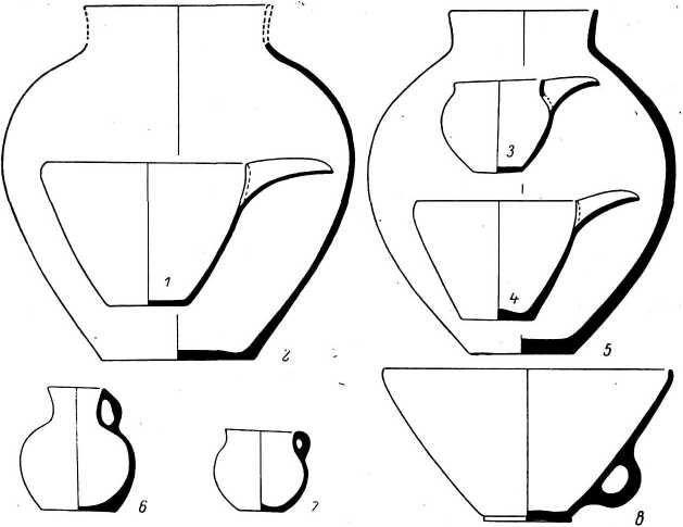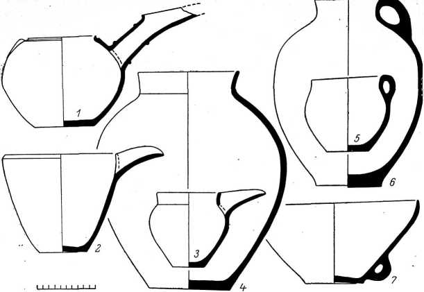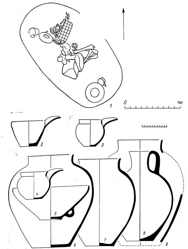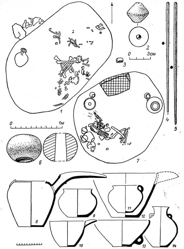 7. Овальная камера, 2.25X1.25 м. Колодец заложен кирпичами. Погребение взрослой женщины уничтожено. Комплекс погребального инвентаря разрушен. Находки: хумча (1а.Лк.5/5), горшочек с открытым носиком (П.Лк.5/5), чаша (Ша.Кс.2/2), чайник (Уа.Лк.2/2), кувшин (УПа.Лк.5/5), горшочек (УШа.Лк.5/5) (табл. ЫХ, 3—8), пряслице, трехбусипная бронзовая серьга (табл. ЬХ1У, 32), два бронзовых колечка, каменная бусина, два альчика.