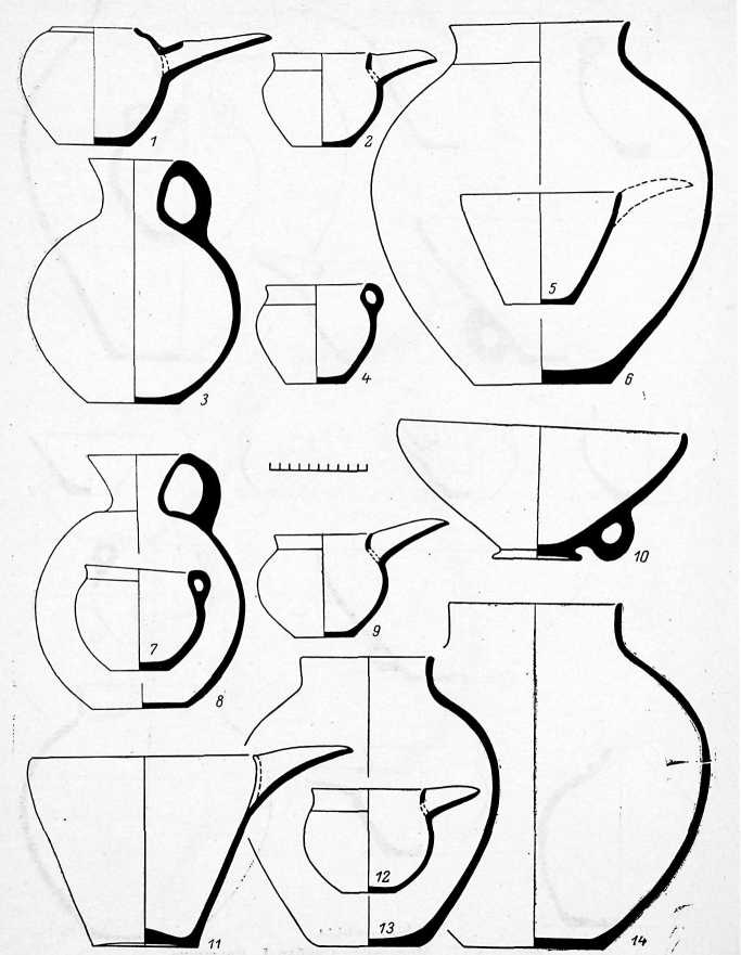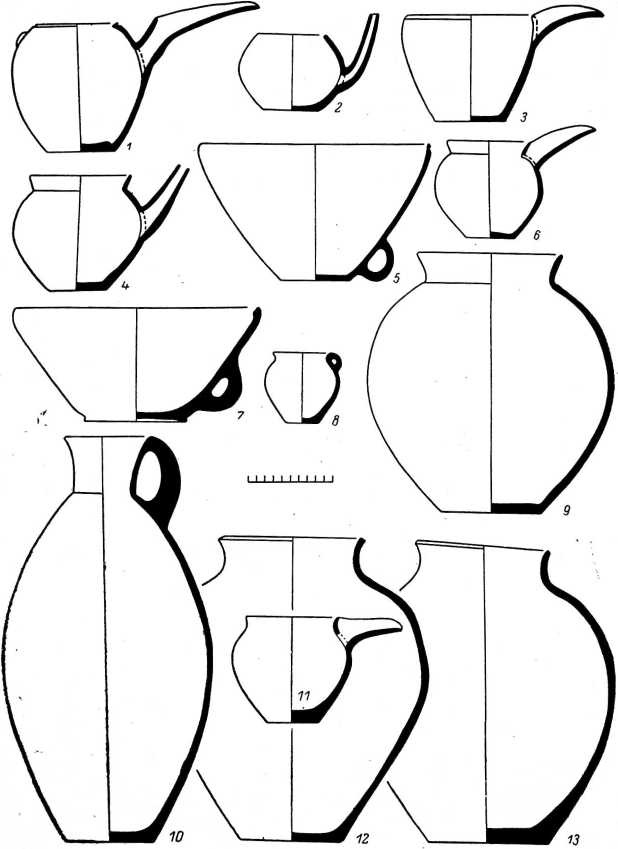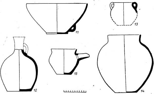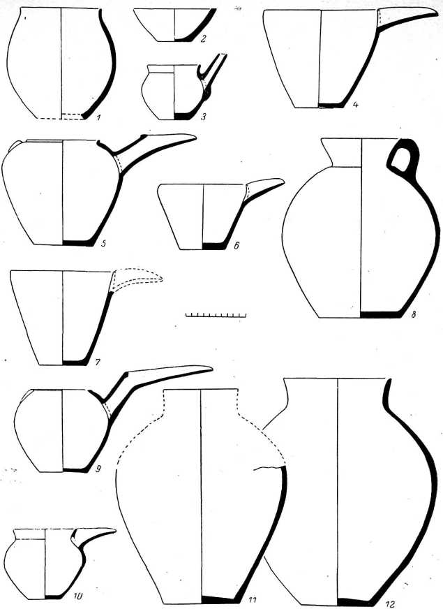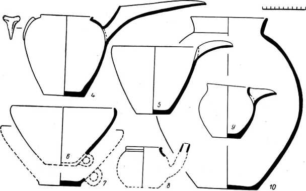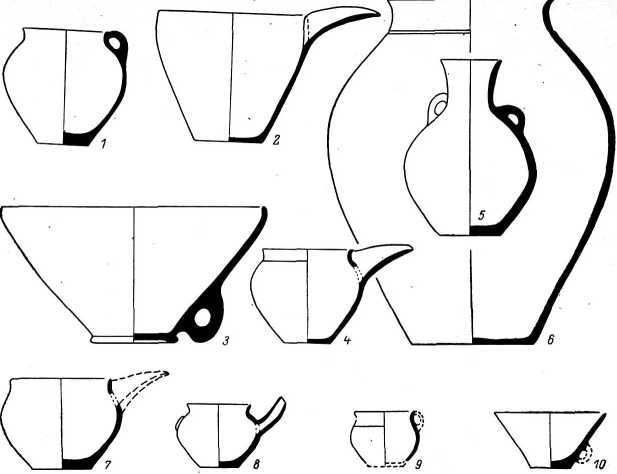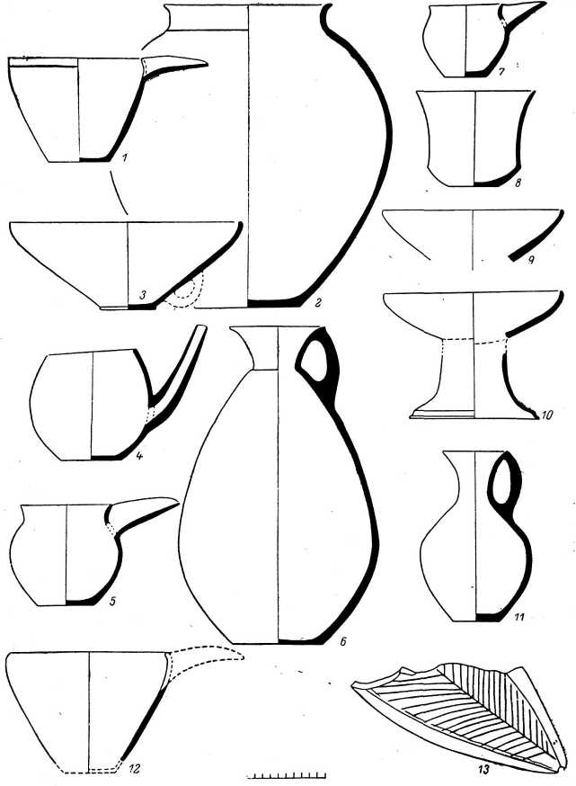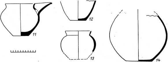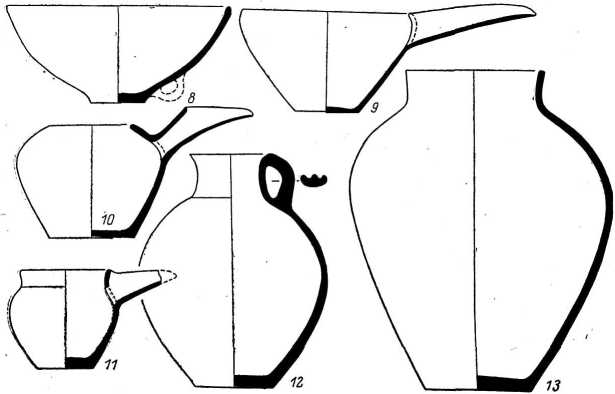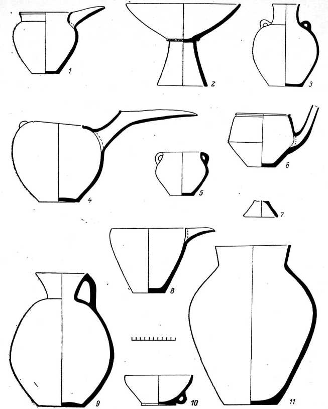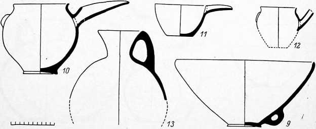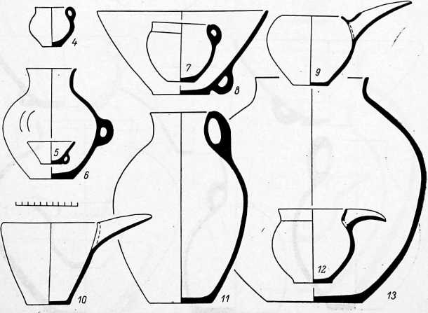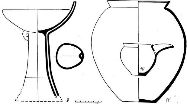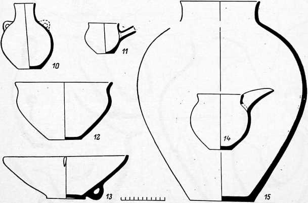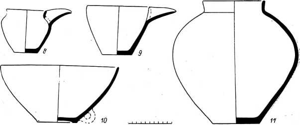 10. Могила разрушена. Погребение взрослого и комплекс погребального инвентаря уничтожены. Находки: горшочек (УШа?.Кс.4х/4), чаша (Ш?.Лк.5/5), конический сосуд со сливом (1Уа.Лк.5/5), кувшин (УП?.Лс.З/3) (табл. ЫХ, 9-12).