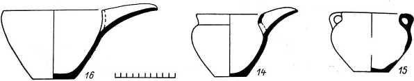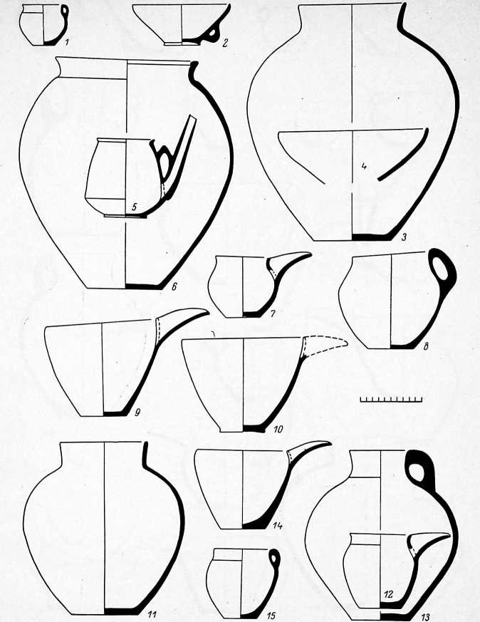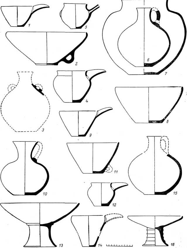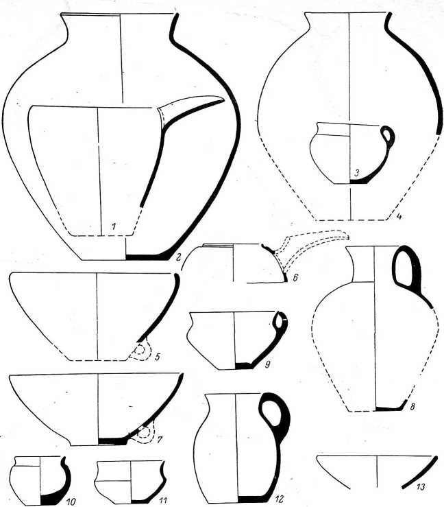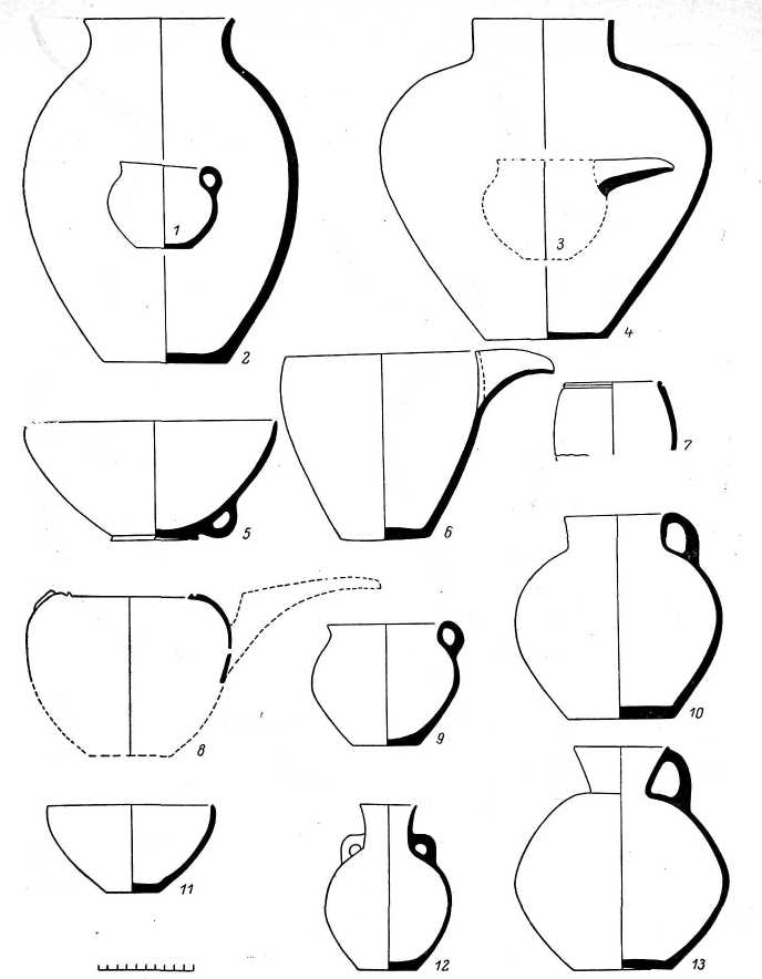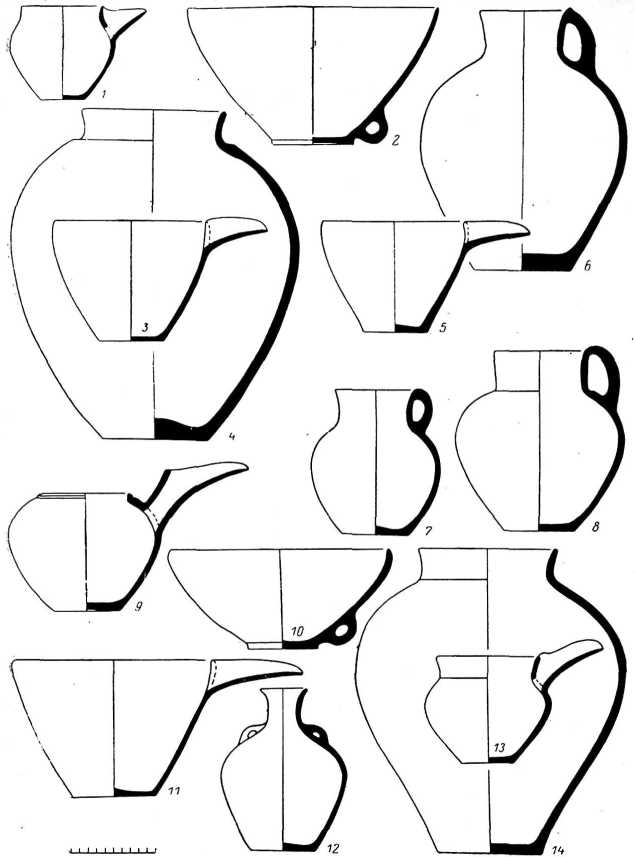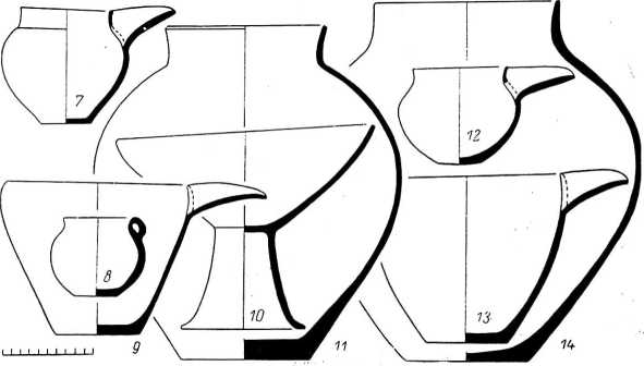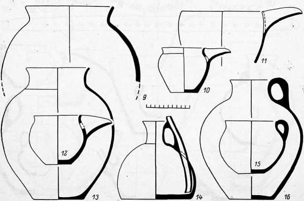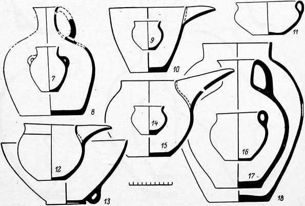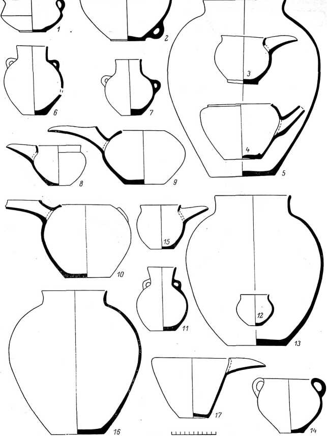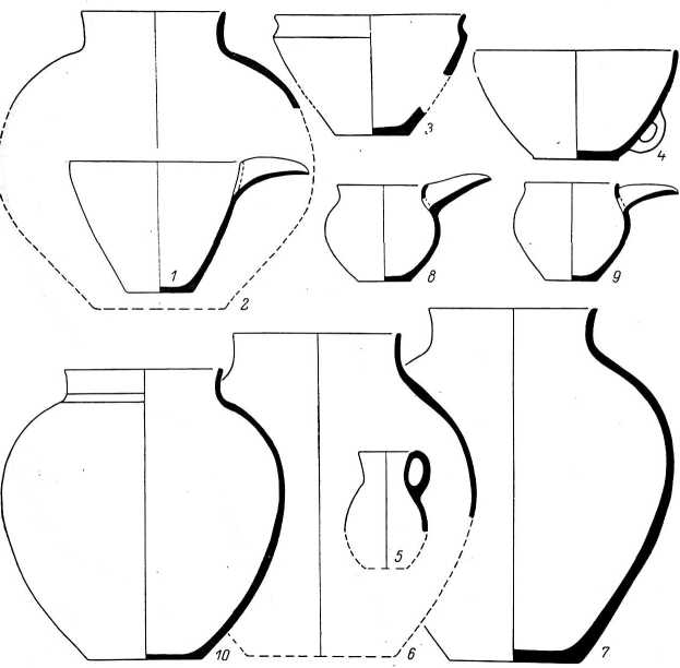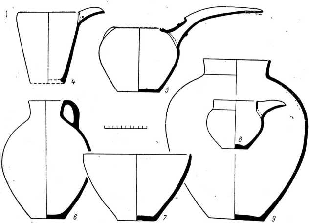 10. Могила разрушена. Погребение взрослого и комплекс погребального инвентаря уничтожены. Находки: горшочек (УШа?.Кс.4х/4), чаша (Ш?.Лк.5/5), конический сосуд со сливом (1Уа.Лк.5/5), кувшин (УП?.Лс.З/3) (табл. ЫХ, 9-12).