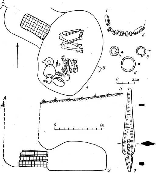 173. А-П (табл. XVIII, 2; XIX, 6, 7). Овальная камера, 0.5X1 м. Штольня заложена кирпичами. Погребение сохранилось: ребенок (мальчик) 2—3 лет на левом боку, головой на ЮЗ, ногами к закладу. Комплекс погребального инвентаря уцелел. Находки: кувшин (VII.Kc.3 + /3), горшочек (УШа.Лк.5/5).