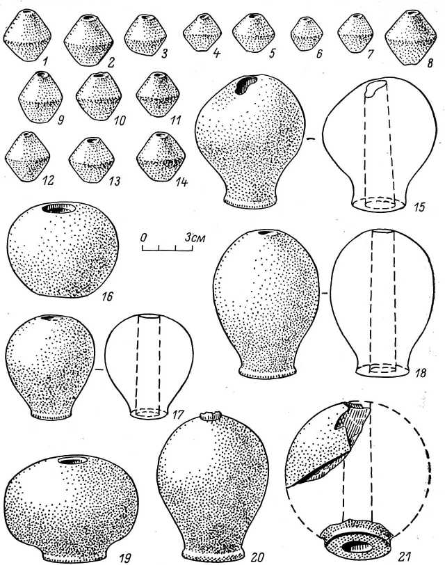 Табл. III. Могильник Сумбар I. , 1—20 — мог. 16; 21 – мог. 49.