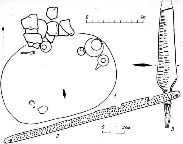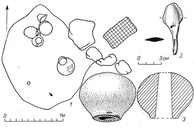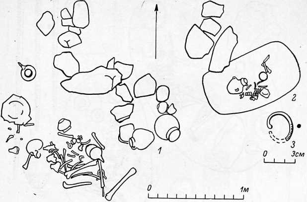 3. Овальная камера, 1.75X1.5 м. Погребение взрослого и комплекс погребального инвентаря уничтожены. Находки: хумча (1д.Кс.2/2), горшочек с открытым носиком (П.Лк.5/5) (табл. XLIX, 5, 6), две бронзовые и три каменные бусины.