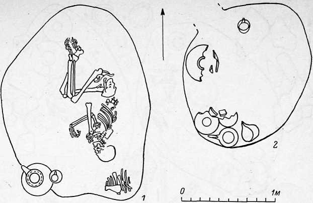 172. А-П. Овальная камера, 2X1.5 м. Колодец (?) заложен камнями. Погребение разрушено, на месте – таз и ноги: женщина 30—35 лет на правом боку, головой на 3, лицом ко входу, на 10; хумча в ногах. Комплекс погребального инвентаря уничтожен. Находки: хумча (1а.Лк.5/5), конический сосуд со сливом (1Уа.Лс.4/4) (табл. XLVI, 16, 17).