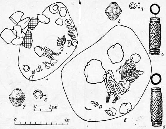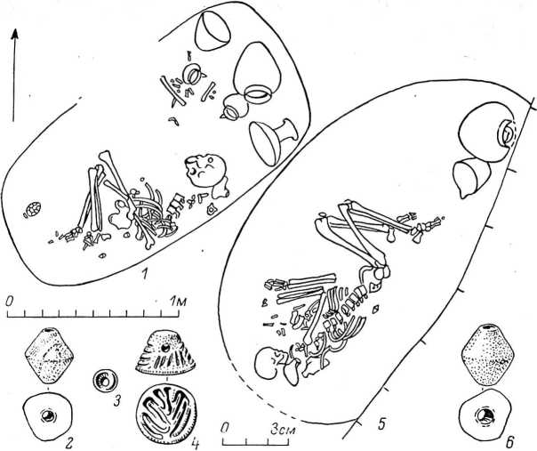 5. Могила разрушена. Погребение сохранилось: ребенок (девочка) 5—7 лет на правом боку, головой на С, лицом на 3. Находок нет.