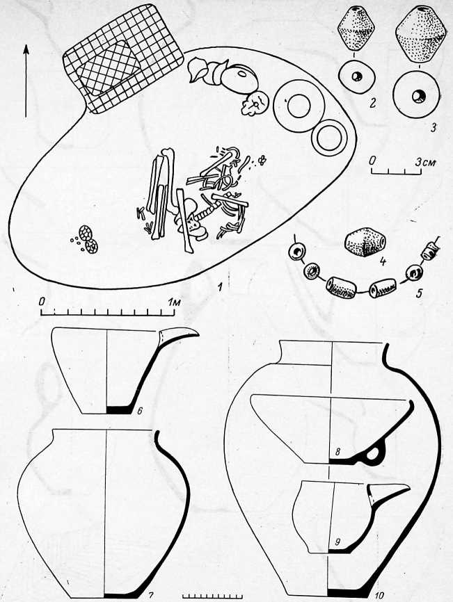 170. B-VIII (табл. XXX, 1—10). Овальная камера, 2.6Х1.4 м. Колодец заложен кирпичами. Погребение потревожено, на месте – позвоночник, таз и ноги: женщина 20—25 лет на правом боку, головой на В, лицом на С, ко входу; все сосуды в головах. Комплекс погребального инвентаря нарушен. Находки: хумча (1а.Лк.5/5), хумча-горшок (1в.Кс.2/2), горшочек с открытым носиком (П.Лк.5/5), чаша (Ша.Кс.2/2), конический сосуд со сливом (1Уа.Лк.1х/1), два пряслица, пять бронзовых и четыре каменные бусины, два панциря черепахи, три альчика.
