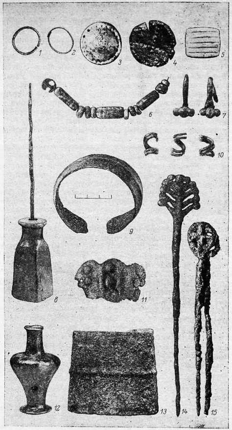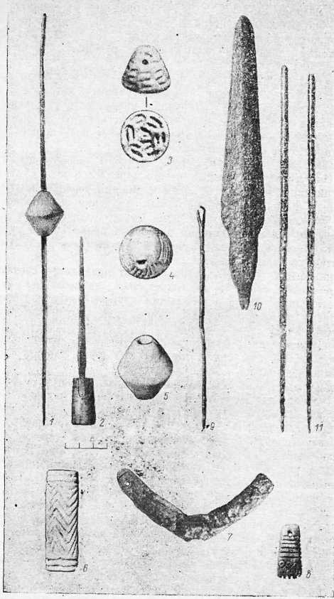 Встреченные парами (иногда по две пары) бронзовые стержни длиной до 20 см, более тонкие с одного конца, являются вязальными спицами (рис. 7, 11).