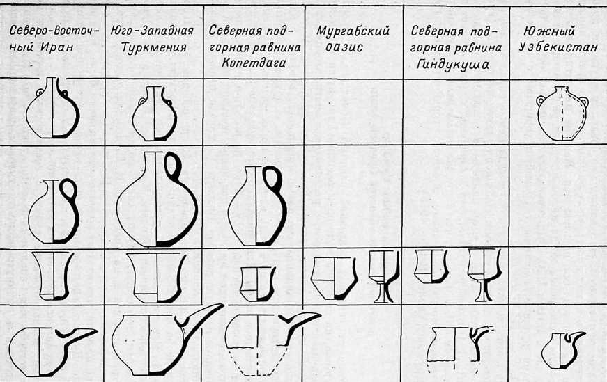 Керамические и вещественные комплексы очагов культуры, расположенных на более поздних территориях Гиркании, Парфии, Маргианы, Бактрии и Согда, поражают единообразием (рис. 11). Истоки этих комплексов уходят в недра развалин южнотуркмеyистанских поселений эпохи бронзы. Анализируя данные комплексы, можно отметить в них следы различного воздействия со стороны культуры Юго-Западной Туркмении и Северного Ирана. Во-первых, на северной подгорной равнине Копетдага керамические комплексы Намазга IV и V сложились в значительной степени под влиянием культуры Юго-Западной Туркмении и Северного Ирана, которая передала местной керамической традиции многие керамические формы; ряд исходных форм для указанных комплексов можно найти в могильнике ранней бронзы Пархай II [Хлопин, Хлопbна, 1979, 1980]. Поскольку керамика названных восточных памятников происходит от комплексов Намазга V и VI, в опосредствованной форме она может быть частично возведена к керамике раннебронзового века ЮгоВосточного Закаспия. Во-вторых, можно улавливать ослабленное влияние комплекса сумбарской культуры на восток: на Аучин-Тепе (Маргиана), в могильнике Дашлы 1 и на Сапалли-Тепе найдены редкие сосуды со сливом. Эти сосуды, а также чайники со сложными носиками (обломки) появились там как результат заимствования из Юго-Западной Туркмении и Северного Ирана одной из наиболее типичных для тех мест и совершенных керамических форм. В-третьих, группа серой керамики из Дашлы 3 и Сапаллb может быть прямым импортом из тех же мест. Следовательно, влияние культуры Юго-Восточного Закаспия распространялось далеко на восток разными путями и его можно рассматривать как доказательство синхронности этих восточных памятников с памятниками культуры ЖВ-1 Северного Ирана.