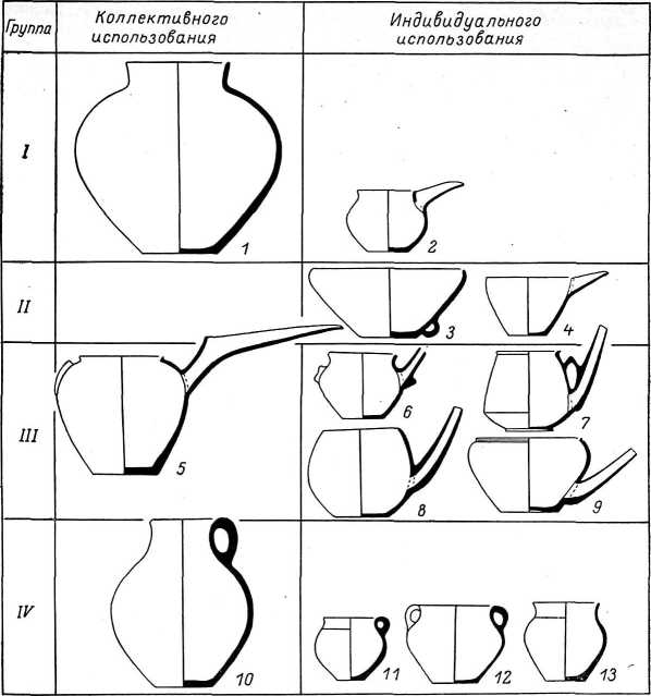 Первичный анализ керамики, проведенный выше, показывает, что глиняное тесто, из которого был изготовлен тот пли иной сосуд, так же как и технология его изготовления, не имеет значения для нашей цели. При определении функции сосуда надо исходить из его формы и типа. Так, коллекция состоит из столовой и хозяйственной (хумчи и большие кувшины) посуды. Кроме того, сосуды резко различаются по величине, что позволяет выделить сосуды коллективного пользования (хумчи, кувшины, чайники со сложным носиком) и индивидуального (различные горшкп, сосуды с трубчатыми носиками, чаши). Поэтому естественно попытаться разделить всю керамическую коллекцию на группы, в каждой из которых сосуд коллективного использования сочетался бы с одним или несколькими сосудами индивидуального применения.