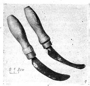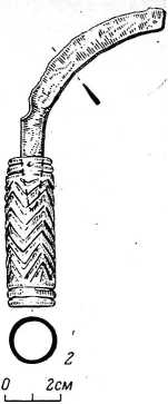 В восьми женских погребениях могильников Сумбар I и Пархай I были найдены предметы, которые дают возможность заново определить древность изготовления ворсовых ковров на территории Южной Туркмении, – серповидные тонкие пластинки с лезвием по выпуклому краю и отверстием на одном из закругленных концов. Ясно, что это узкоспециализированный режущий инструмент, применявшийся для какой-то женской отрасли производства, но в то же время достаточно редкий. У современных ковровщиц широко используется такой же точно, но, естественно, железный нож-кесер (рис. 23, 1) для единственной операции – обрезания ворсовой нити ковра. Эта операция происходит в тот момент, когда узел уже завязан на нитях основы и его опускают на готовую часть изделия. Мастерица держит кесер в правой руке и, с силой опуская узел обеими руками, как бы касается нити остро отточенным лезвием; такого прикосновения достаточно для того, чтобы узел с ворсом оставить па месте, а при следующем движении рук вверх уже выделить те нити основы, вокруг которых завязывается следующий узел. Серповидная форма ножа является наиболее удобной, целесообразной и отработанной, ибо позволяет лезвию одновременно и перерезать нить любым местом, и скользить по пей. Поскольку нажим на лезвие ничтожен, то клинок ножа очень слабо крепится в рукояти, иногда – на глубину 1—1.5 см. Зная все особенности современного коврового ножа, их можно обнаружить и у древних ножей, которые найдены в могилах эпохи поздней бронзы. Они имеют идентичный изгиб лезвия, слабое скрепление с рукоятью при помощи небольшой, видимо, деревянной шпильки.