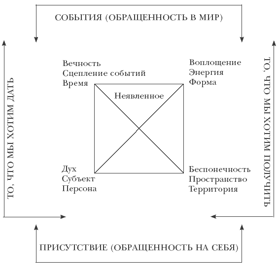 Пространство сознания – это тоже дитя неявленного. Форма – это упаковка неявленного. Исходным интеллектуальным инструментом будет так называемое Большое целое. Инструмент построен на базе такого сделанного, как метод качественных структур И. И. Калинаускаса, который существует в двух формах – в форме векторной структуры и в форме квадрата аспектов, который сформулирован совместно с Г. Рейниным. Это разные вещи, и ими надо по-разному пользоваться.