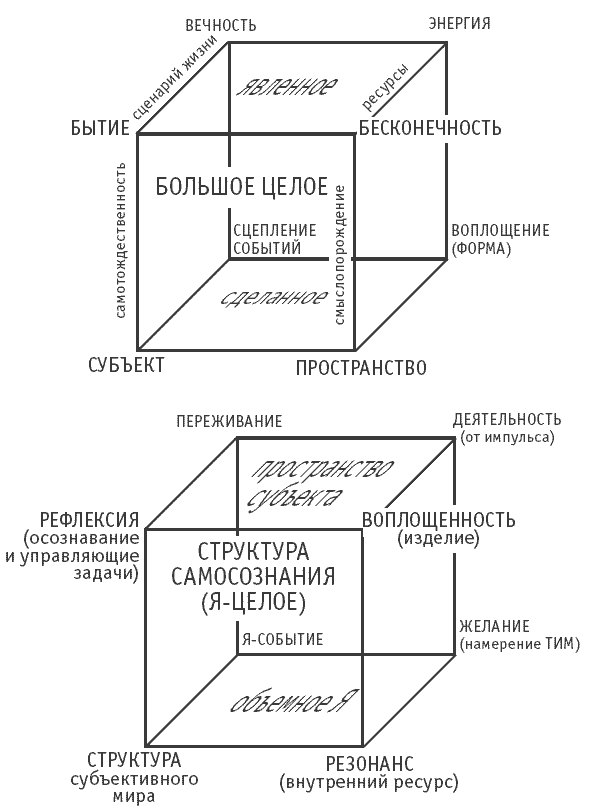 Посмотрим на две взаимосвязанные и взаимообусловленные объемные структуры: Большого целого, состоящего из явленного и сделанного, и пространства нашего сознания, состоящего из объемного Я и Я-субъекта (рис. 9). Это необходимо, чтобы корректно мыслить о взаимосвязях и взаимодействии человека и реальности.
