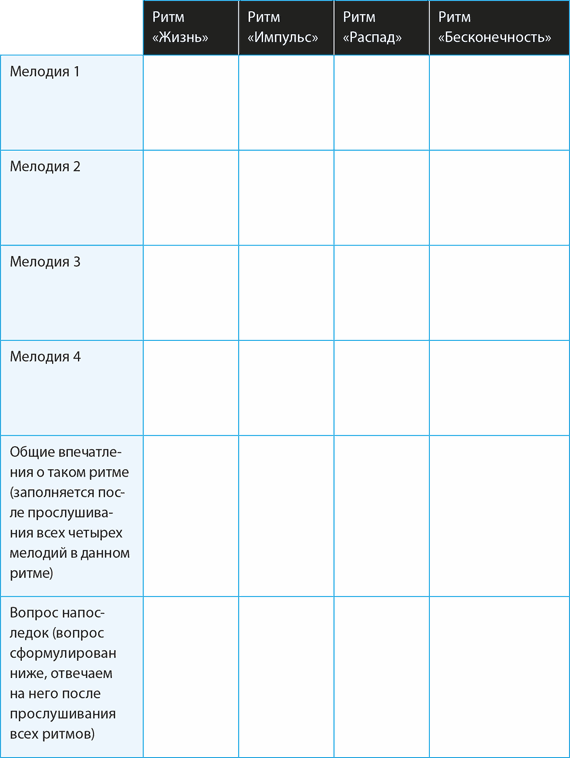 После прослушивания каждой из мелодий вписывайте в ячейки таблицы по одному слову, которым можно выразить свое впечатление от нее.
