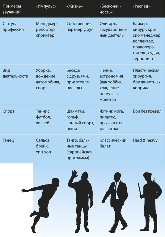 Ритм – основное понятие («язык») резонанса. У каждого пространства – свой ритм. У каждой ситуации – тоже свой ритм. И таких ритмов можно насчитать всего-то четыре вида. Каждый из них может ассоциироваться с каким-то цветом, видом освещения, едой, напитком, занятием, временем года и т. д. Мы различаем, излучаем и воспринимаем четыре ритма: «Жизнь», «Импульс», «Распад», «Бесконечность».