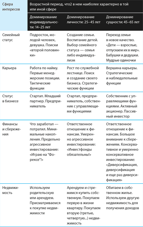 Вот какую фразу я вычитал в Facebook: «Переход от детства к молодости, потом к зрелости – в отношении к травке: сначала на ней валяешься, потом куришь, ну а теперь – завариваешь». А если серьезно, то у человека есть три основных периода жизни: доминирование индивидуальности (14–25 лет), доминирование личности (25–45 лет) и доминирование сущности (45–65 лет). Каждому из них присуща своя энергетика. Причем, как известно, эти три основных периода разделены двумя наиболее известными кризисами смысла жизни. «Кризис среднего возраста» из этой же оперы.