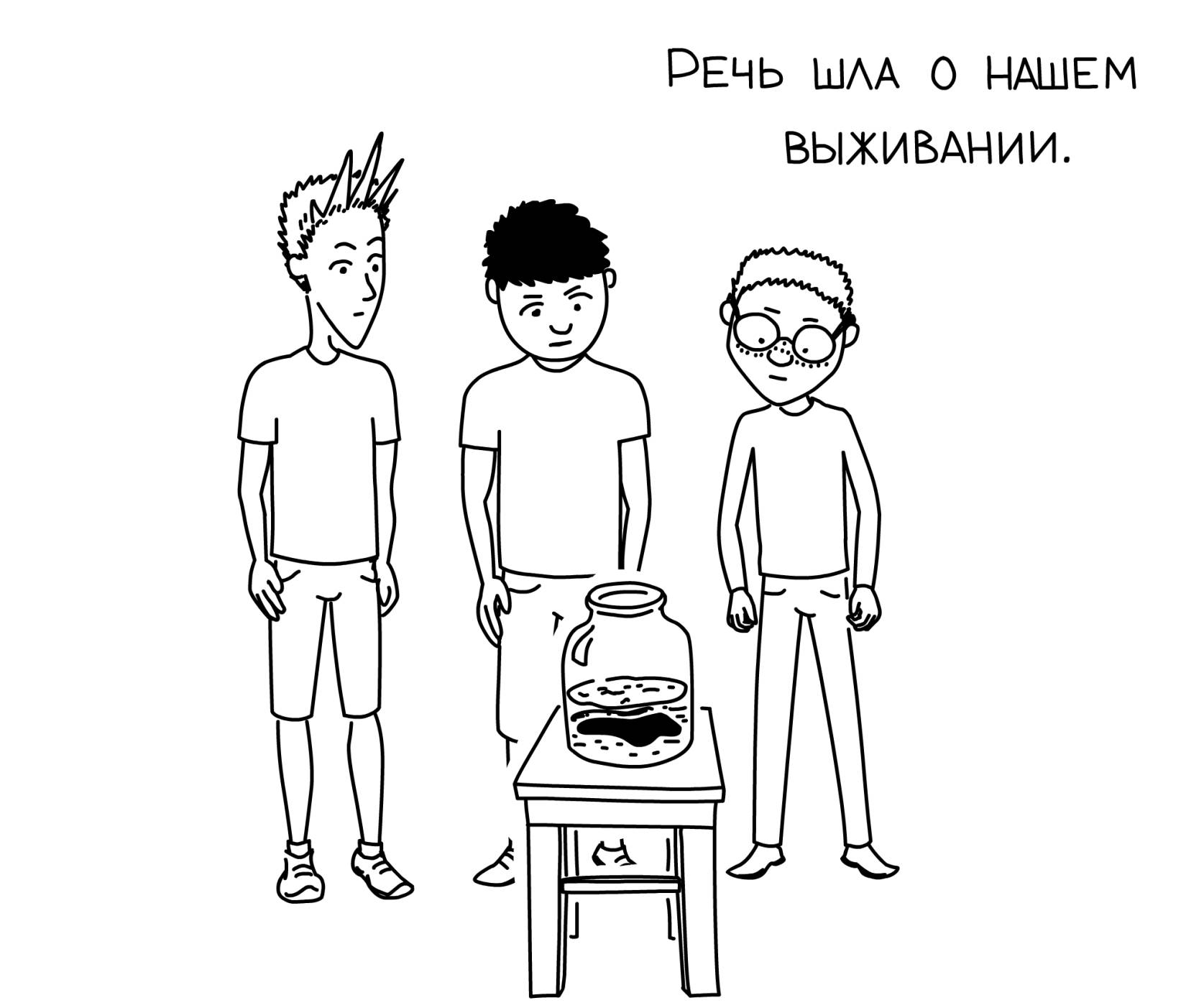 Тогда Ромыч поинтересовался о ГЛАВНОМ: будут ли нас кормить? И Никита уже раскрыл рот, чтобы ответить. Но в этот момент его взгляд упал на заполненную до краёв вонючую банку, стоящую рядом с неряшливой кроватью Ерохи…