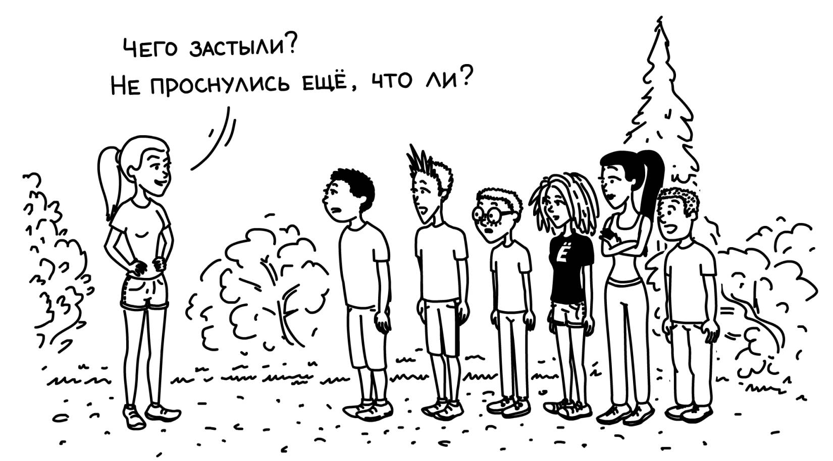 – Доброе утро, четвёртый отряд! Лагерь «Старт-Шум-Гам» приветствует новый отличный день. Ну-ка, все выходите на зарядку!
