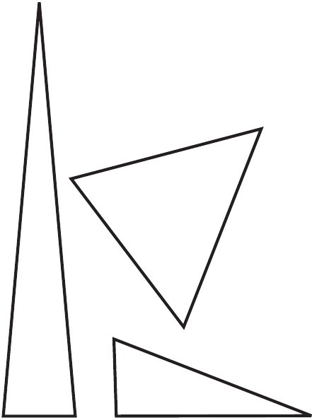 Органы чувств живого существа воспринимают на рисунке 2 не просто совокупность отдельных черных штрихов, а схематическое изображение листа, так как главное, что отражает психика,– это соотношение этих штрихов, воссоздающее структуру объекта. И эта структура воспроизводит бесчисленное количество других листьев, ее можно сохранять в памяти живого существа. Так, изображенные на рисунке 3 и впервые воспринятые совершенно различные фигуры все же воспринимаются как треугольники, благодаря соотношению трех углов. В то время как психика животного их таковыми не воспримет, а психика кольчатого червя их не воспримет вообще.
