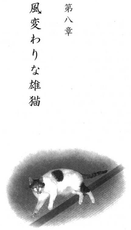 突然、裕美の足に何かしっとりして柔らか く、そして温かいものが触れた。一そう、雄猫 のミケだ。ミケはもう4歳になる。家族みんな のペットで、特にサツキが可愛がっている。た だ、障子などあちらこちらに穴を空け、特に古 い畳,を爪で引つ搔くので、母がしょっちゅう追 い払っている。白い毛並みに濃い灰色の模様 のあるキジ猫で、鮮やかなピンク色の鼻をして いる。3年前どこから彼はやって来たのか誰も 知らない。 ここでは多くの人が猫を飼ってい る。ミケは大きくはないが、最近急に肥ってき た。首はどこにあるか判らず、地面を引きずる ような白い短い脚が特徴だ。そして彼はいつも どこかで獲物を捕ってきて、常に縄張りを歩 き回っている。その上、彼の行動から判断する に、人に対し媚を売ることと同じようにいつも 何かを探し廻っている油断のならないまめな奴 でもある。