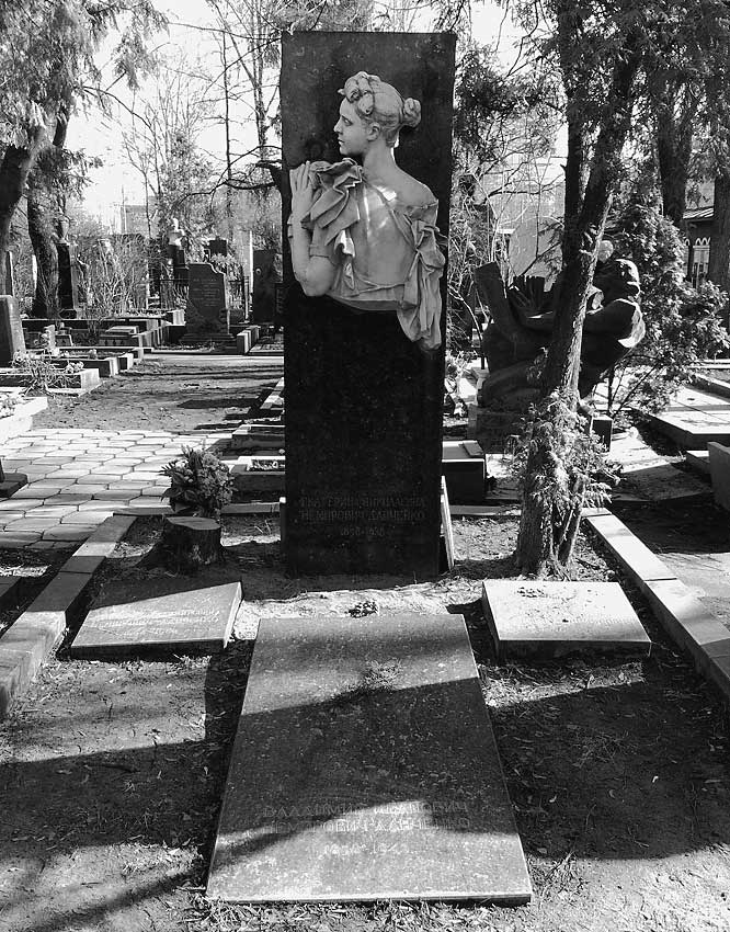 Могильная плита самого Владимира Ивановича довольно скромна. Зато обращает на себя внимание чудный белый горельеф – изображение Екатерины Николаевны Немирович-Данченко, урожденной баронессы Корф. Это была красивая история любви. Да и сама Екатерина Николаевна была прекрасным человеком. Недаром Станиславский называл ее «заведующей душевной частью» Художественного театра.