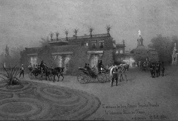 Поскольку тогда было не до торжественных встреч, то невесту везли в Ливадийский дворец в простой открытой карете. Ехали двумя каретами: в первой – дамы, во второй – мужчины. Судя по акварели очевидца событий, придворного художника М. Зичи, придворные, конечно, собрались у дворца, но ни о какой торжественной встречи невесты цесаревича не было и речи.