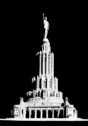 В тридцатые годы столица представляла собой большую строительную площадку. Свободных площадей в Москве, даже в ее центре, было немало. На левом берегу Москвы-реки в 1937 году было заложено невиданное для нашей страны сооружение – Дворец Советов. По проекту верхняя отметка Дворца достигала высоты 415 метров. С отметки 315 метров здание по проекту завершала гигантская статуя вождя мирового пролетариата Владимира Ильича Ленина.